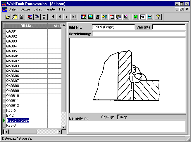 Die Felder Bild-Nr und Variante dienen im Modul Schweißanweisung zum Auswählen einer benötigten Skizze. Dabei kann zum Beispiel die Bild-Nr = 'KN' für Kehlnaht enthalten und Variante = 'M' für mehrere Lagen stehen. Die Aufteilung in Hauptskizzen und Varianten bleibt jedoch dem Anwender selbst überlassen.