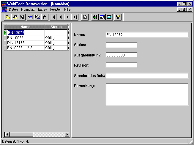 Der Status kennzeichnet die aktuelle Gültigkeit der angezeigten Norm. Im Feld Name ist die korrekte Bezeichnung des Normblattes einzutragen. Auf diese Bezeichnung wird in den Datenbanken für Werkstoffe und Schweißzusatzwerkstoffe verwiesen.