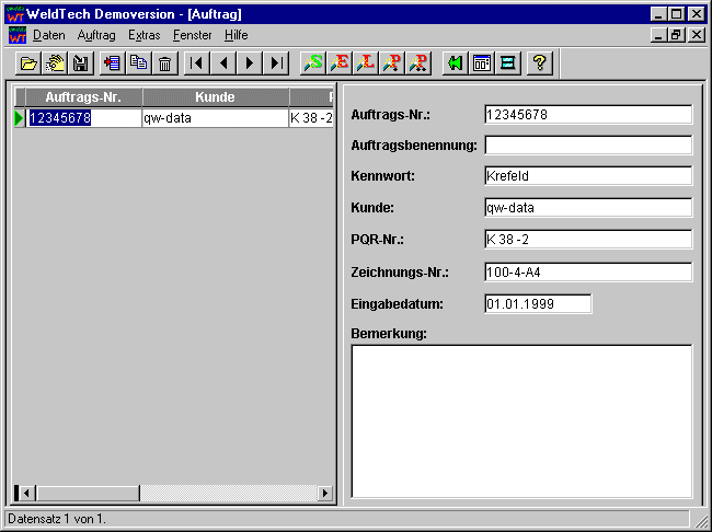 Nach dem Starten des Moduls Kunden-Schweißanweisungen wird die Auftragsansicht geöffnet. Hier werden alle angelegten Aufträge verwaltet. Soll eine auftragsbezogene Schweißanweisung erstellt werden, so muß zunächst der entsprechende Auftrag angelegt werden.