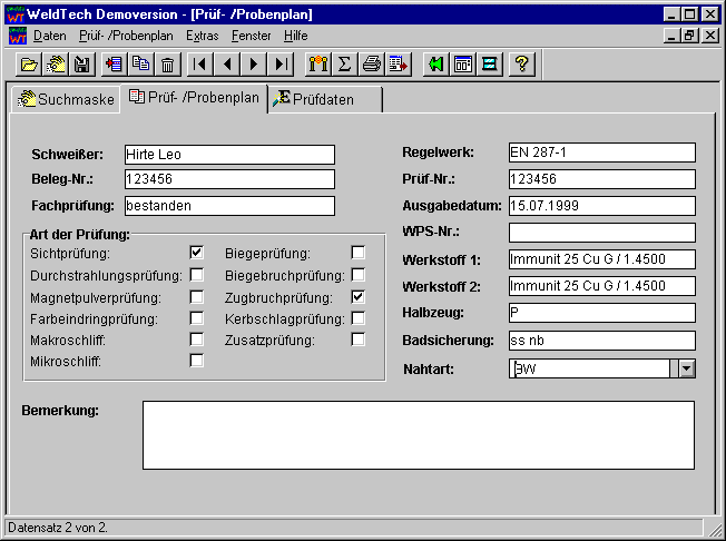 WeldTech 2.2.2 Arbeitsseite Prüf-/Probenplan