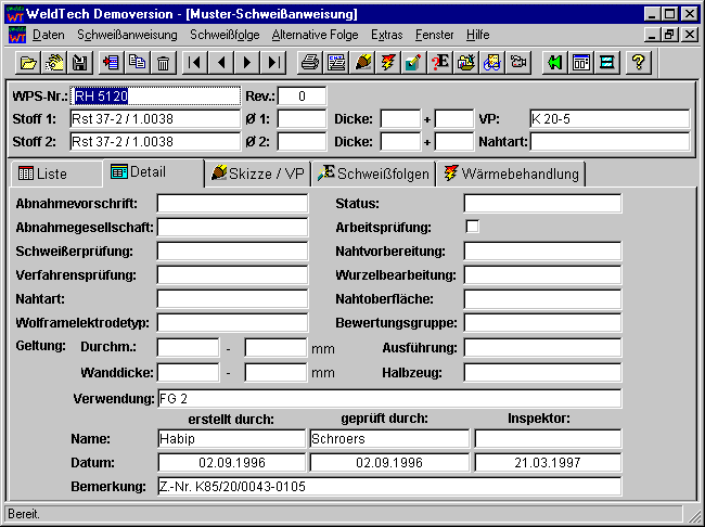 Angaben zur Schweißanweisung eingetragen. Die meisten Felder erklären