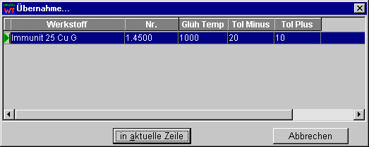 Aus dieser Liste wird der entsprechende Parametersatz gewählt und durch
