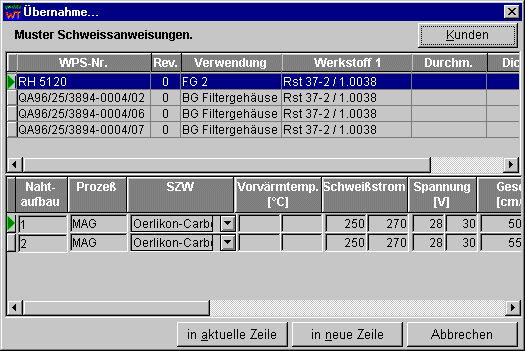 die alle Muster- bzw. Kunden-Schweißanweisungen enthält, die auf der