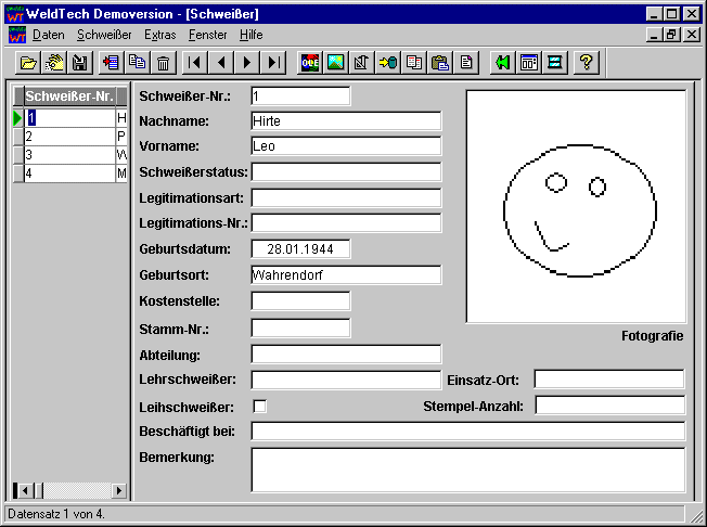 Die Arbeitsseite Schweißpersonal besteht aus zwei Bereichen. Im linken Bereich befindet sich eine Liste, in der alle Mitarbeiter mit ihren persönlichen Daten aufgeführt sind. Mittels Mausklick auf den gewünschten Datensatz wird dieser aktiviert und im rechten Bereich angezeigt. Hier befindet sich ein Datenblatt, auf dem alle Personaldaten des aktuellen Mitarbeiters aufgeführt sind.