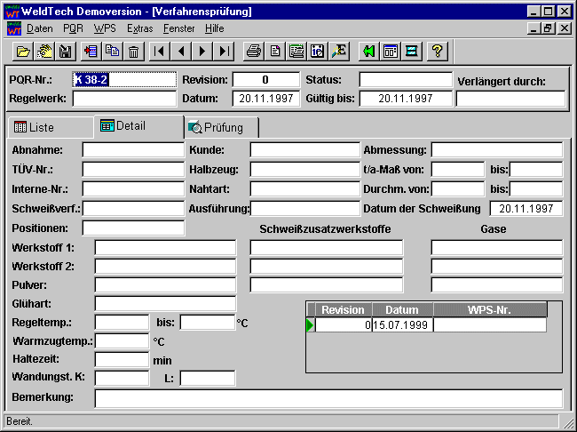 Im unteren rechten Bereich der Arbeitsseite Detail befindet sich eine kleine Liste. Hier wird ein Bezug zu der Schweißanweisung gebildet, mit der die aktuelle Verfahrensprüfung qualifiziert wurde. In den Feldern WPS-Nr., Datum und Revision sind die jeweiligen Daten der Schweißanweisung eingetragen.
